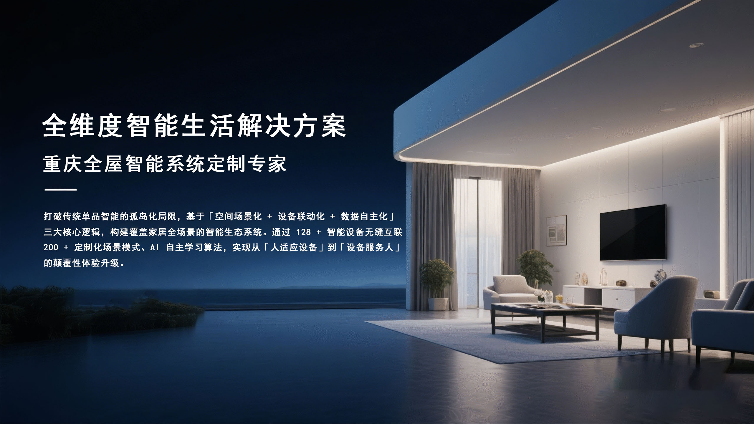 3D智能建模技术+专业设计师团队,量身打造”会客模式””睡眠模式”等12种智能场景,操作界面适配手机/平板/语音多终端。